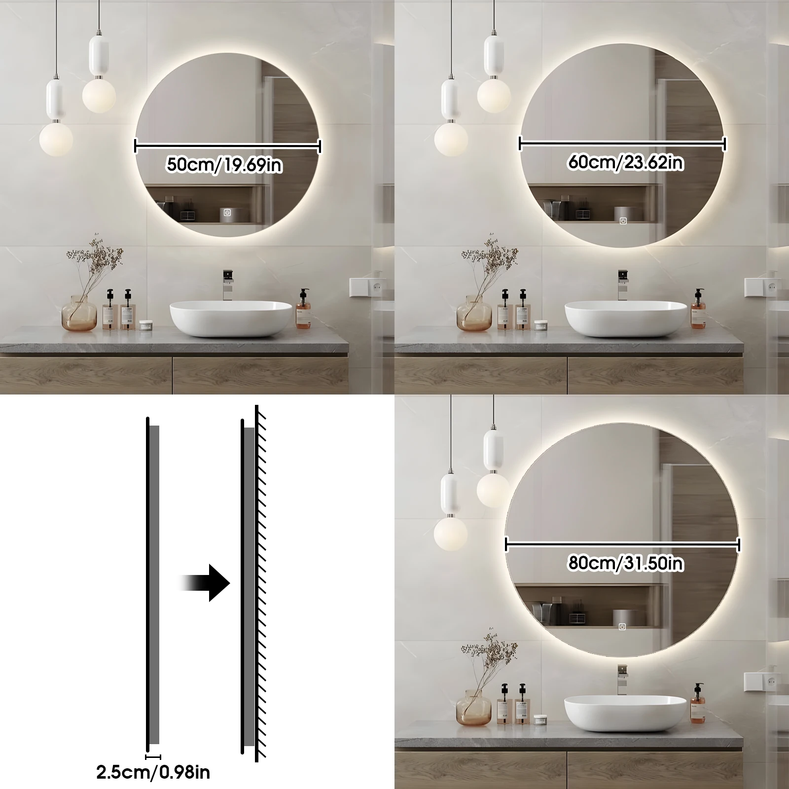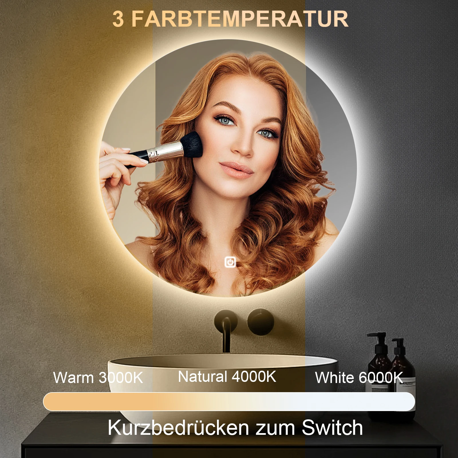 3. Brightness of our LED lighting bathroom mirror can be adjusted easily by long-pressing on touch sensor button. Besides, simply short-pressing on touch button to switch 3 kinds of color temperature modes: Warm Lighting (3000K); Natural Lighting (4000K); White Lighting (6000K).